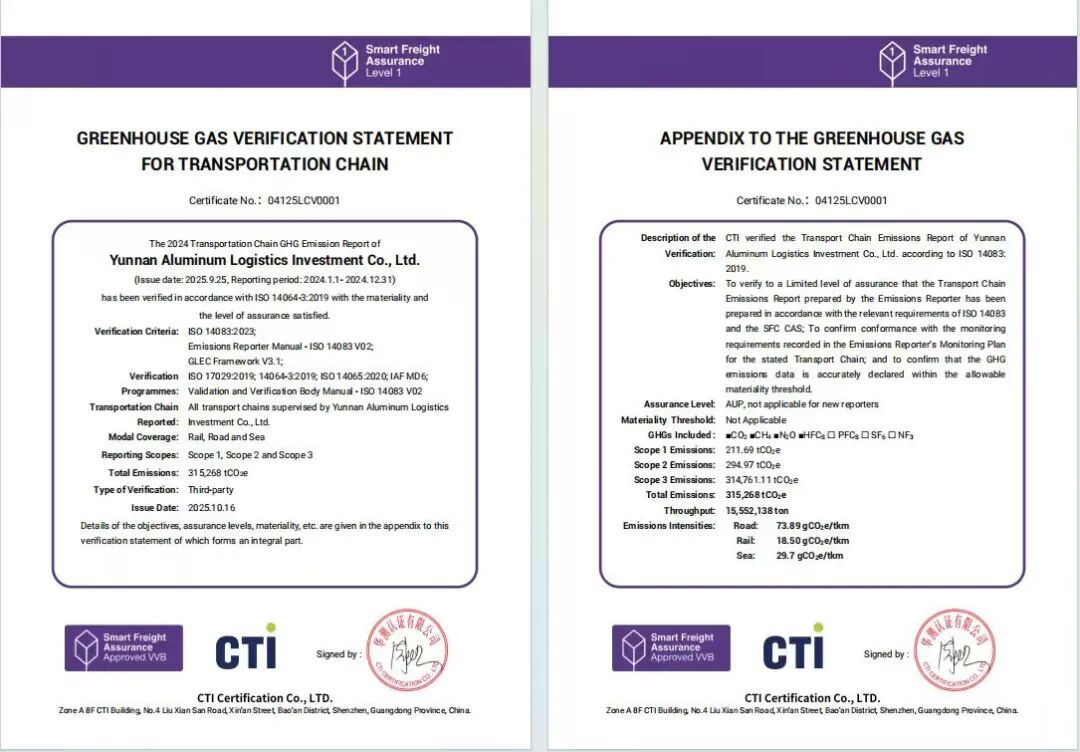 在国家大力推动“智能化、绿色化、融合化”发展战略的指引下,云铝物流深度融合先进信息技术与物流业务,全力打造智能化物流体系,并率先通过ISO 14083:2023运输链温室气体排放国际核查,成为国内物流运输领域首家完成碳排放核查的企业。