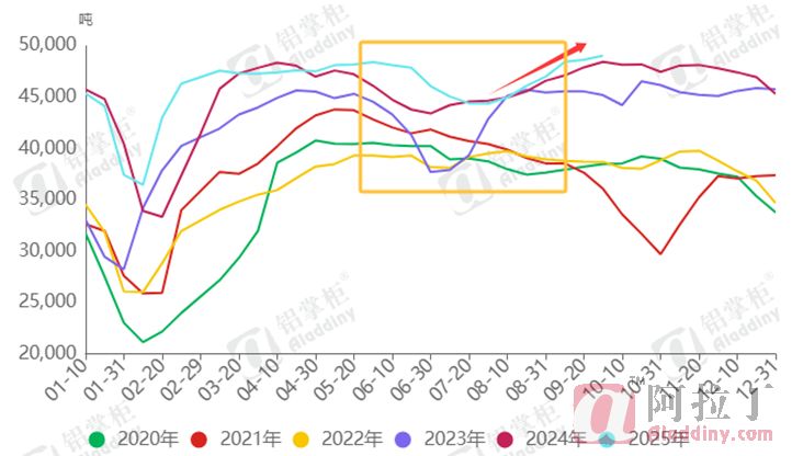 从2025年年内铝价整体走势看,影响铝价的各类因素中,产业链因素常常退居次席,但鉴于国庆节前与2023年同期的诸多类同因子,在推演国庆节后铝价走势之前,我们不妨多借鉴一下以下几张产业链因素图。