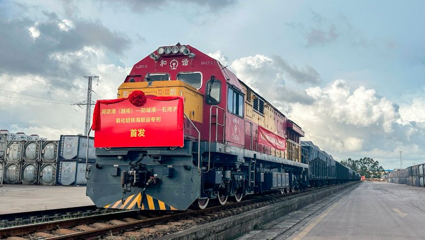 从国铁南宁局获悉,10月15日下午,满载3000吨越南氧化铝的铁海联运专列从广西防城港车站开出,沿着西部陆海新通道北上驶向新疆石河子。这是广西开出的首趟自越南同奈港至新疆的氧化铝铁海联运专列,开辟了东南亚经北部湾港至新疆能源产业基地间的物流快车道,为推动国内国际双循环、降低企业物流成本提供有力的运输保障。