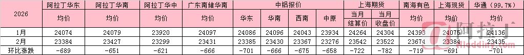 2026年2月铝锭国内各市场平均价(按月统计):元/吨