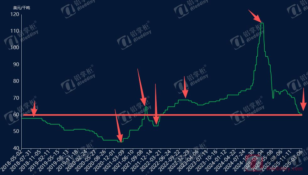 2022年3月至2026年3月四年间,几矿价格走势清晰:2022年3月受中国氧化铝产能大幅扩张带动需求增长,叠加2023年6月印尼禁止铝土矿出口带来的供应冲击,矿价在2022年3月至2025年1月整体呈阶梯式上行,从60.5 美元/干吨涨至高点115 美元/干吨,用时近34 个月;而从 115 美元回落至60.5 美元/干吨,仅用14个月。