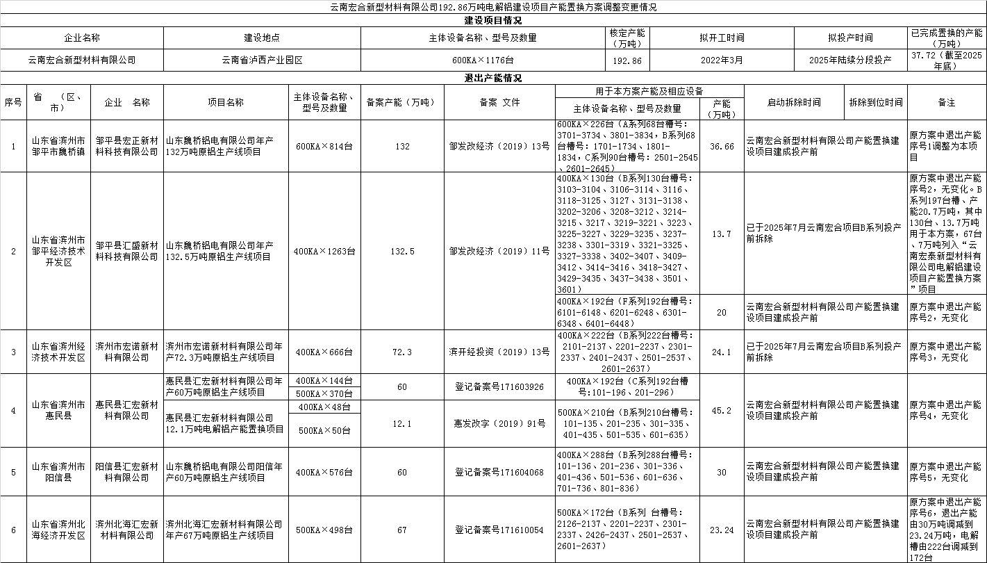 附件:1.云南宏合新型材料有限公司192.86万吨电解铝建设项目产能置换方案调整变更情况