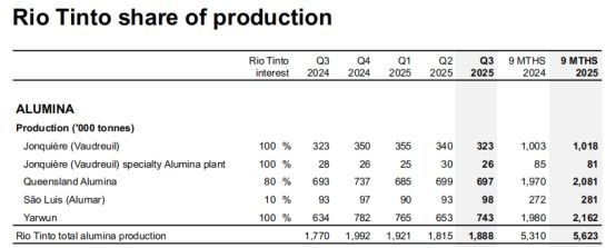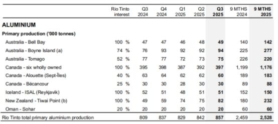 阿拉丁(ALD)综合海外媒体消息,近日,力拓(Rio Tinto)发布2025年第三季度运营报告。