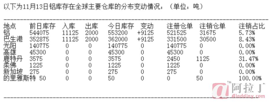 11月13日LME铝库存分布情况