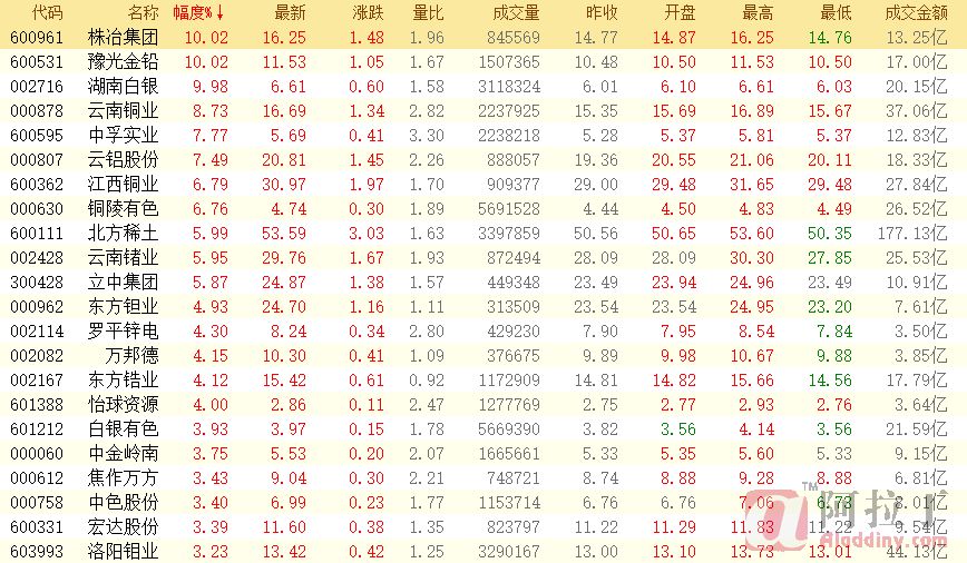 与期货市场类似的是,有色金属板块今日整体表现亮眼,铜铝等多个股票盘中触及涨跌,截至收盘亦有多只股票涨幅超过6%。