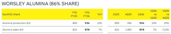 具体来看,第三季度沃斯利氧化铝厂产量93.4万吨,环比基本持平,同比增长10%。产量维持稳定主要得益于供应至氧化铝厂的铝土矿有所改善,同时按计划完成了煅烧炉维护工作。2026财年产量指导目标仍维持在375万吨不变。由于上一季度库存消耗及船期安排因素,2025年第三季度销售额同比下降12%。
