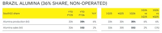 第三季度巴西氧化铝厂产量35.4万吨,环比增长6%,同比增长6%。因设备运转率提升,该氧化铝厂产能利用率已超过设计标准。2026财年产量指导目标仍维持在136万吨不变。