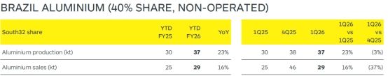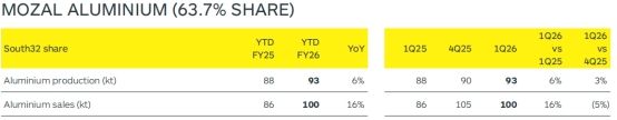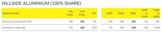 第三季度希尔塞德(Hillside Aluminium)铝冶炼厂产量18.1万吨,环比持平,同比增长1%;尽管受到限电影响,该冶炼厂仍持续进行最大技术负荷测试。2026财年产量指导目标继续保持在72万吨。由于一批货船延期至2025年12月季度发运,本季度销售额同比下降13%。