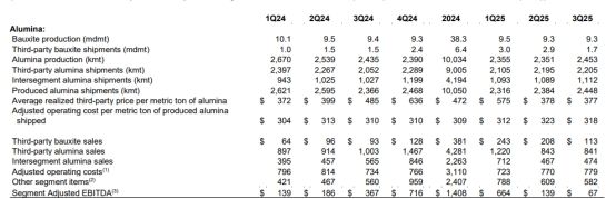 三季度公司营收达到29.95亿美元,略低于前一季度30.18亿美元,但高于去年同期29.04亿美元。第三季度归属于公司的净利润为2.32亿美元,较第二季度1.64亿美元增长41.5%,同比去年第三季度0.9亿美元增长158%,但其中包括了8.95亿美元的Kwinana氧化铝厂关闭重组费用和7.86亿美元的出售Ma'aden合资企业股权的收益等一次性项目。剔除一次性项目后,公司实际录得调整后净亏损600万美元(每股亏损0.02美元),反映出核心运营面临压力。
