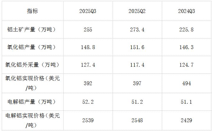 三季度铝土矿产量达到255万吨,环比减少7%,同比增长13%;氧化铝产量达到148.8万吨,环比减少2%,同比增长2%;外采氧化铝量达到127.4万吨,环比增长9%,同比增长2%;电解铝产量为52.2万吨,环比增长2%,同比增长2%。
