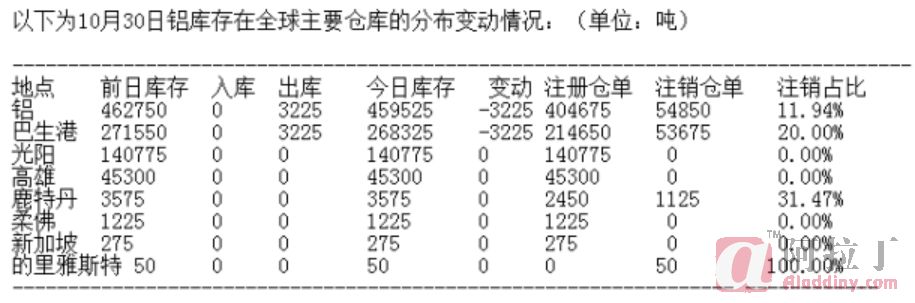 10月30日LME铝库存分布情况