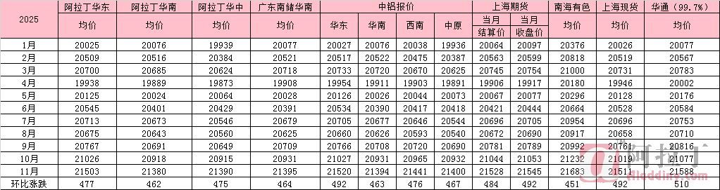 2025年11月铝锭国内各市场平均价(按月统计):元/吨