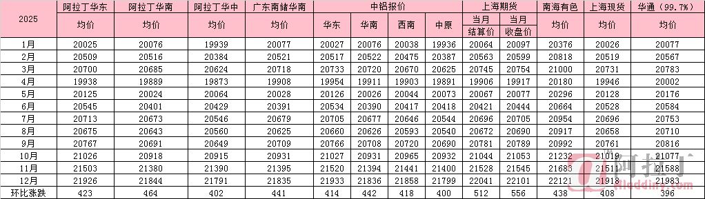 2025年12月铝锭国内各市场平均价(按月统计)